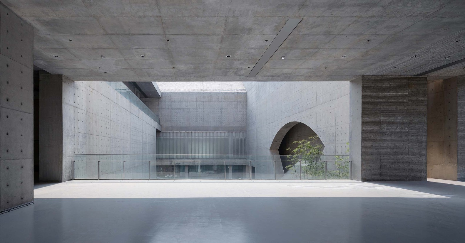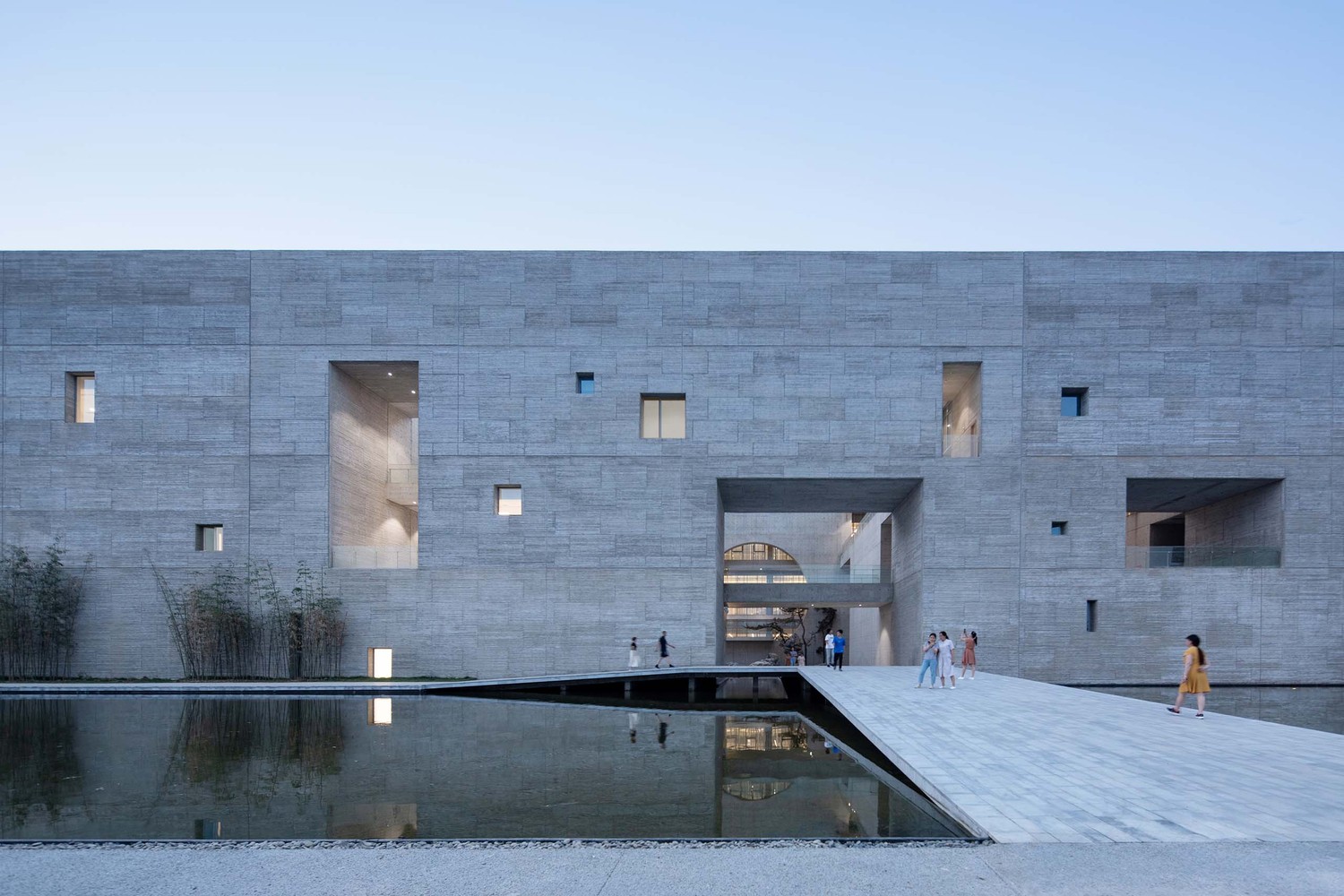 壽縣文化中心采用清水混凝土建設(shè)而成,內(nèi)設(shè)多個尺度各異的院落被置于相對方正、封閉的矩形塊之中,一條蜿蜒起伏,時上時下的公共廊道將它們串聯(lián)起來。每一個功能擁有兩到三個內(nèi)院,建筑主入口的前院尺度較大,形成了一個公共廣場,意味著壽縣民居中的前院和“堂屋”,建筑后部的后院又有著壽縣民居中“后花園”的味道。這條漫游環(huán)道,引導(dǎo)著人們緩步橋上,穿越水面,步入建筑之中。從前院開始,在不打斷室內(nèi)連續(xù)性的前提下,人們可以穿梭游覽于,布滿了很多內(nèi)院的整個建筑。沿著這個可遮陽避雨的環(huán)形廊道,參觀者時而在一層,時而又到了二、三層,空間變幻莫測,光影時明時暗,去探索發(fā)現(xiàn)令人意想不到的驚喜,感悟“藏、息、修、游”所賦予中國傳統(tǒng)建筑的藝術(shù)精神。