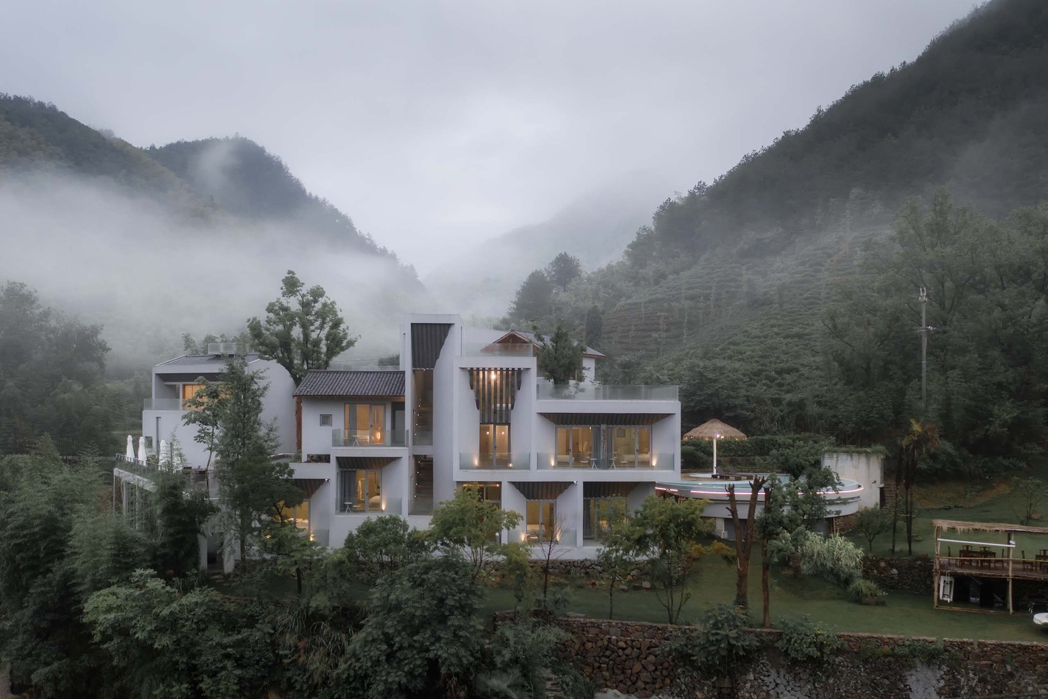 山澗房采用清水混凝土材料建造而成,由具體的使用需求,場地中形成了三棟建筑單體,同時也是三個不同姿態(tài)的“山”。因場地紅線的限制,呈三角形布局。前山平緩,橫向舒展。后山高聳,撲面而來。側(cè)山則臥于一側(cè)。角落一圓形“月塘”,成為實(shí)際功能中的泳池。自河對岸遠(yuǎn)望,前山后山形成“深遠(yuǎn)”之勢,自內(nèi)庭仰看后山,如“高遠(yuǎn)”而望,氣勢突兀,山勢逼人。對山而望,三個人造山同背后自然遠(yuǎn)山層巒疊嶂,以崇山復(fù)嶺,密樹深溪的景象形成“平遠(yuǎn)”之意。山澗之間,遙望一間木屋,屋下仿佛有瀑布跌入溪澗,是畫意中點(diǎn)睛之筆。