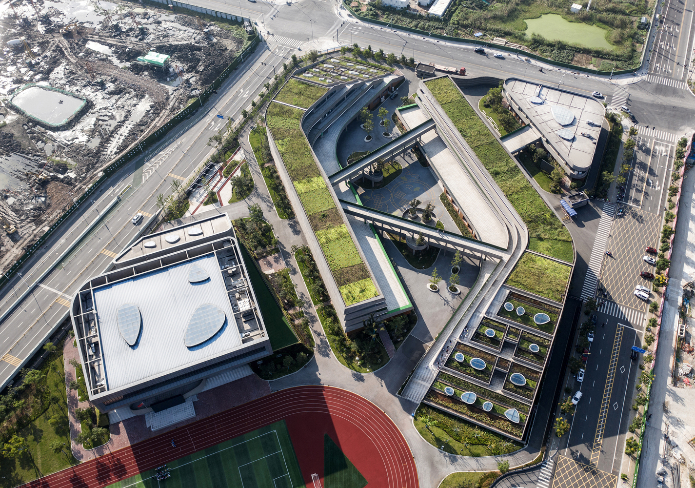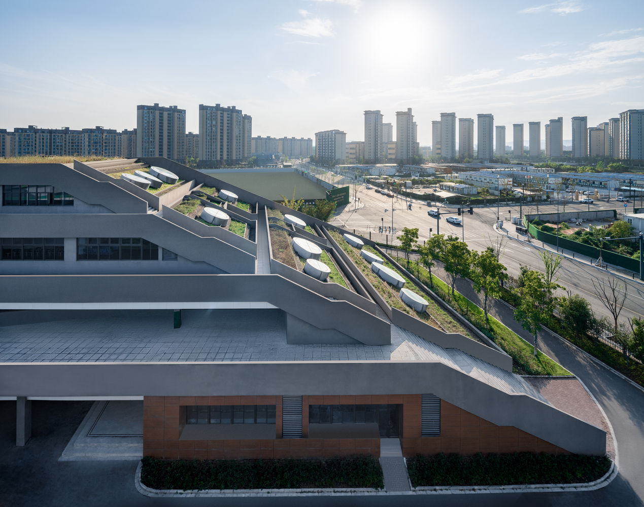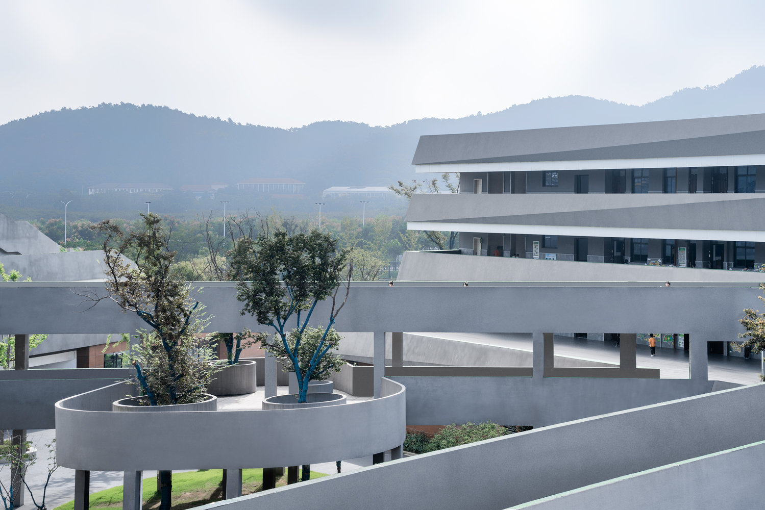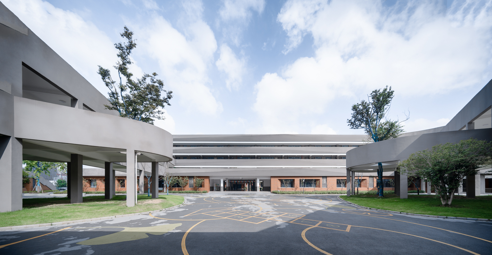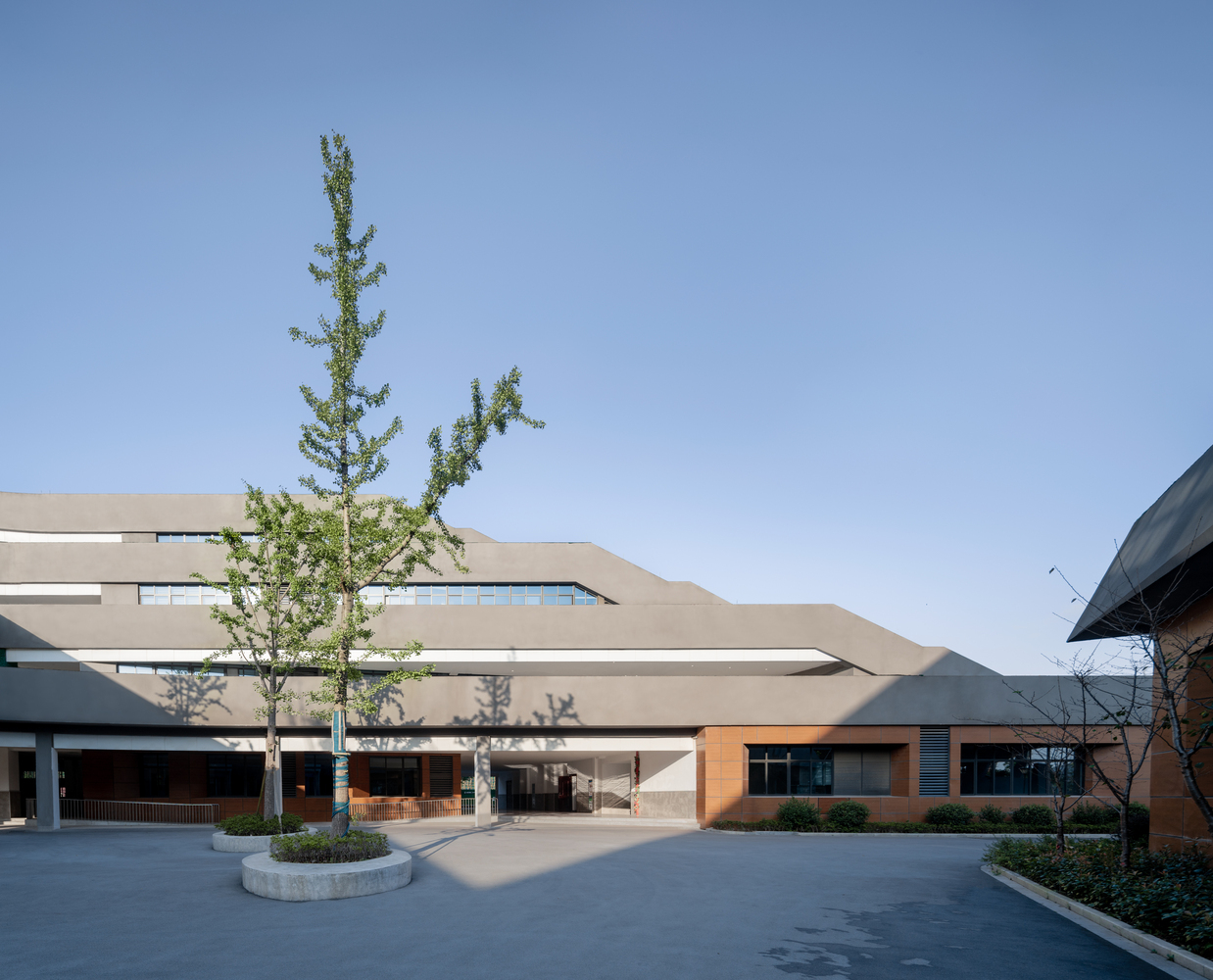 西南小學位于中國·浙江湖州經(jīng)濟開發(fā)區(qū),校園的北側為社會公園,南側隔河而望連綿漸隱的天目山脈。西南小學就選址于這山城之間,乘著這山水的靈秀,開始一段“巡檐風與月,隱幾水兼山”的建造之旅。建筑的的造形十分的奇特,以天目山的“目”字為結構,風格也十分的新穎,建筑外表皮采用清水混凝土掛板打造,以全新素顏面貌與遠處的天目山合諧的融為一體。