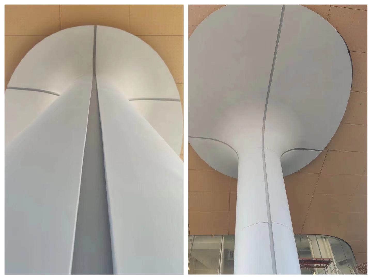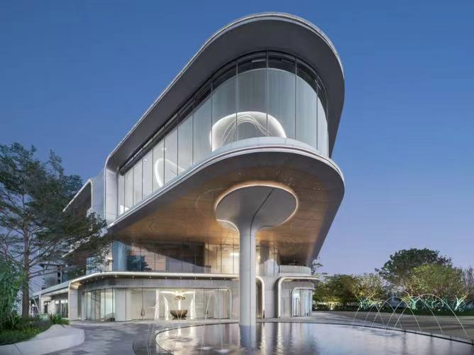 得益于UHPC優(yōu)異的材料屬性,能制作大規(guī)格及大異型的預制構(gòu)件,為建筑幕墻裝飾行業(yè)帶來了更多的可行性。完工后的柱體造型流暢,美觀獨特,現(xiàn)代輕奢。窄橫縫、寬豎縫的建筑成品更給人視覺上”無橫縫“的效果。UHPC表面質(zhì)地細膩,讓其融入水景,與水面景觀相輔相成,互相促進。