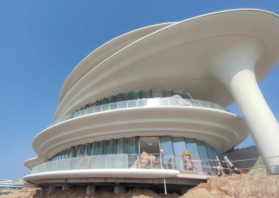 砼創(chuàng)為珠海三角島城市會(huì)客廳UHPC幕墻材料的供應(yīng)商和施工單位,該工程使用20MM厚度UHPC平板、曲板、柱子等造型拼接而成。