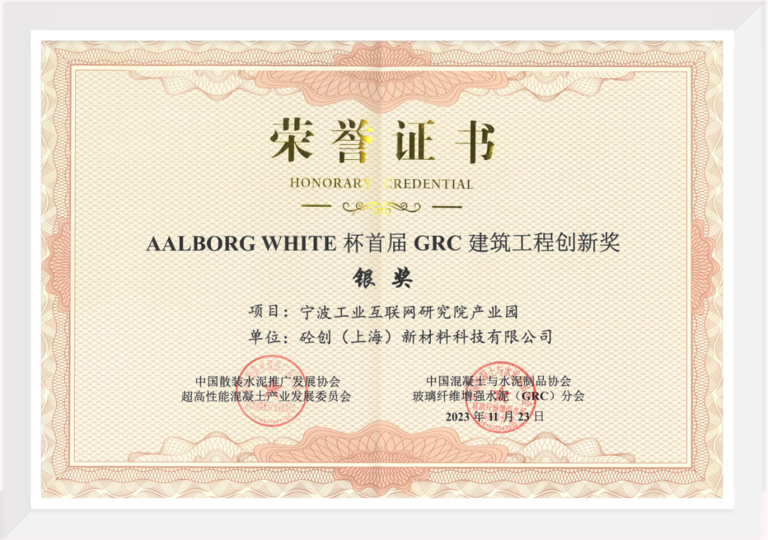 砼創(chuàng)(上海)新材料科技有限公司在此次參賽中摘得一金一銀的好成績(jī)。UHPC參賽項(xiàng)目:皇家馬德里足球世界體驗(yàn)中心,獲得“首屆UHPC建筑工程創(chuàng)新獎(jiǎng)-金獎(jiǎng)”;GRC參賽項(xiàng)目:寧波工業(yè)互聯(lián)網(wǎng)研究院產(chǎn)業(yè)園獲得“首屆GRC建筑工程創(chuàng)新獎(jiǎng)-銀獎(jiǎng)”。